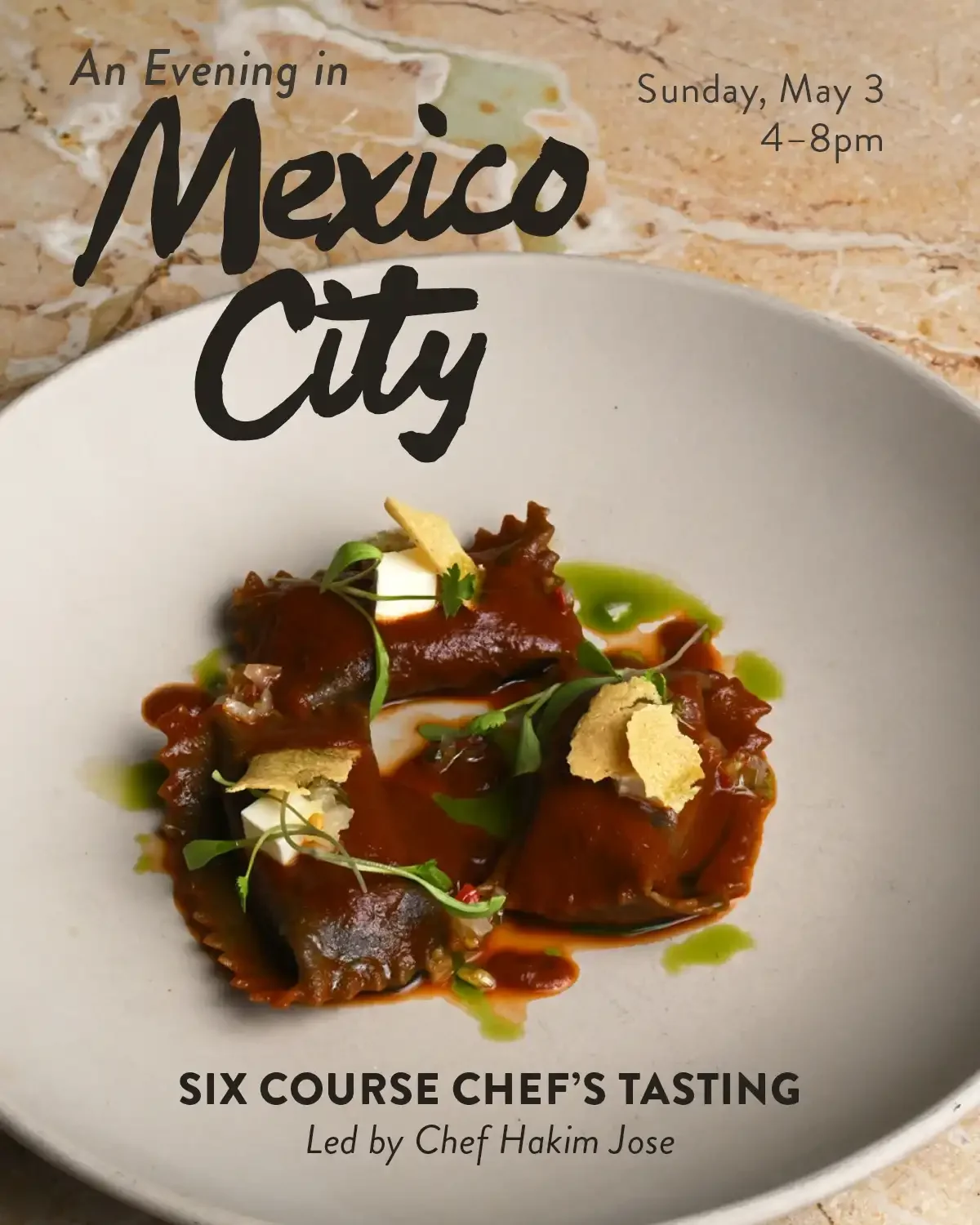 The evening will unfold as a six-course tasting menu exploring the flavors, techniques, and traditions of the region. This is a one-night experience inspired by the cuisine of the Land of Fire.